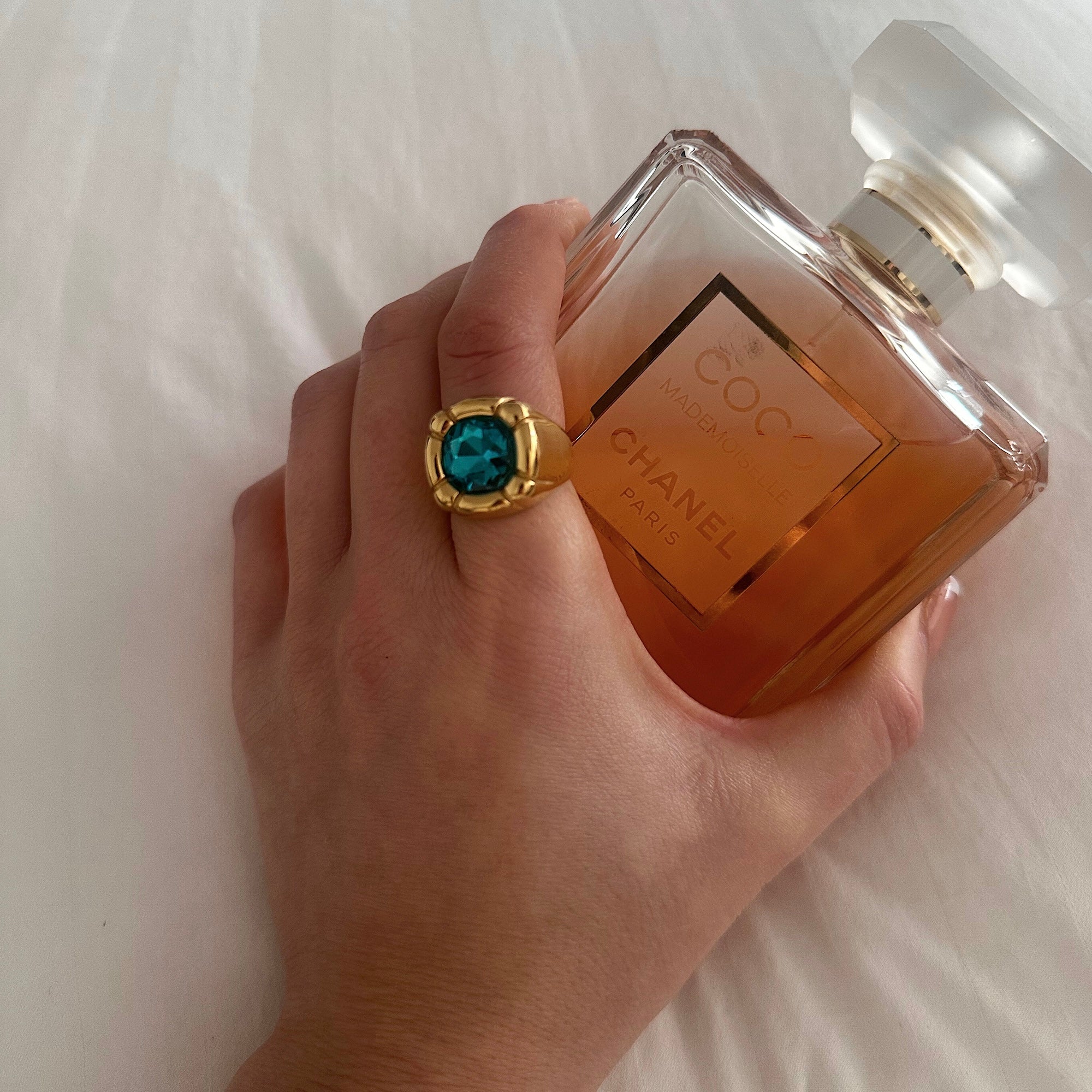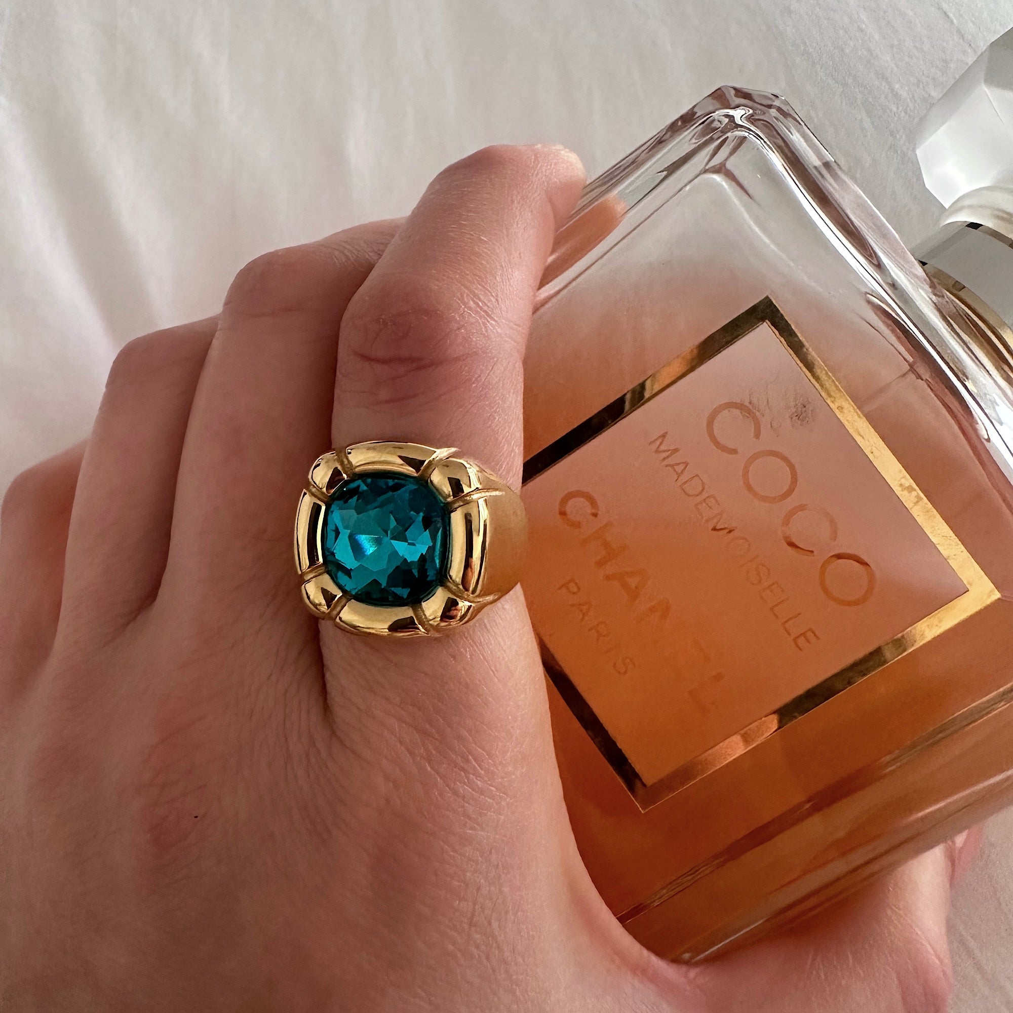 Anillo de acero titanio con 6 capas de oro de 18k , tiene un cristal AAA grande en la parte frontal color verde