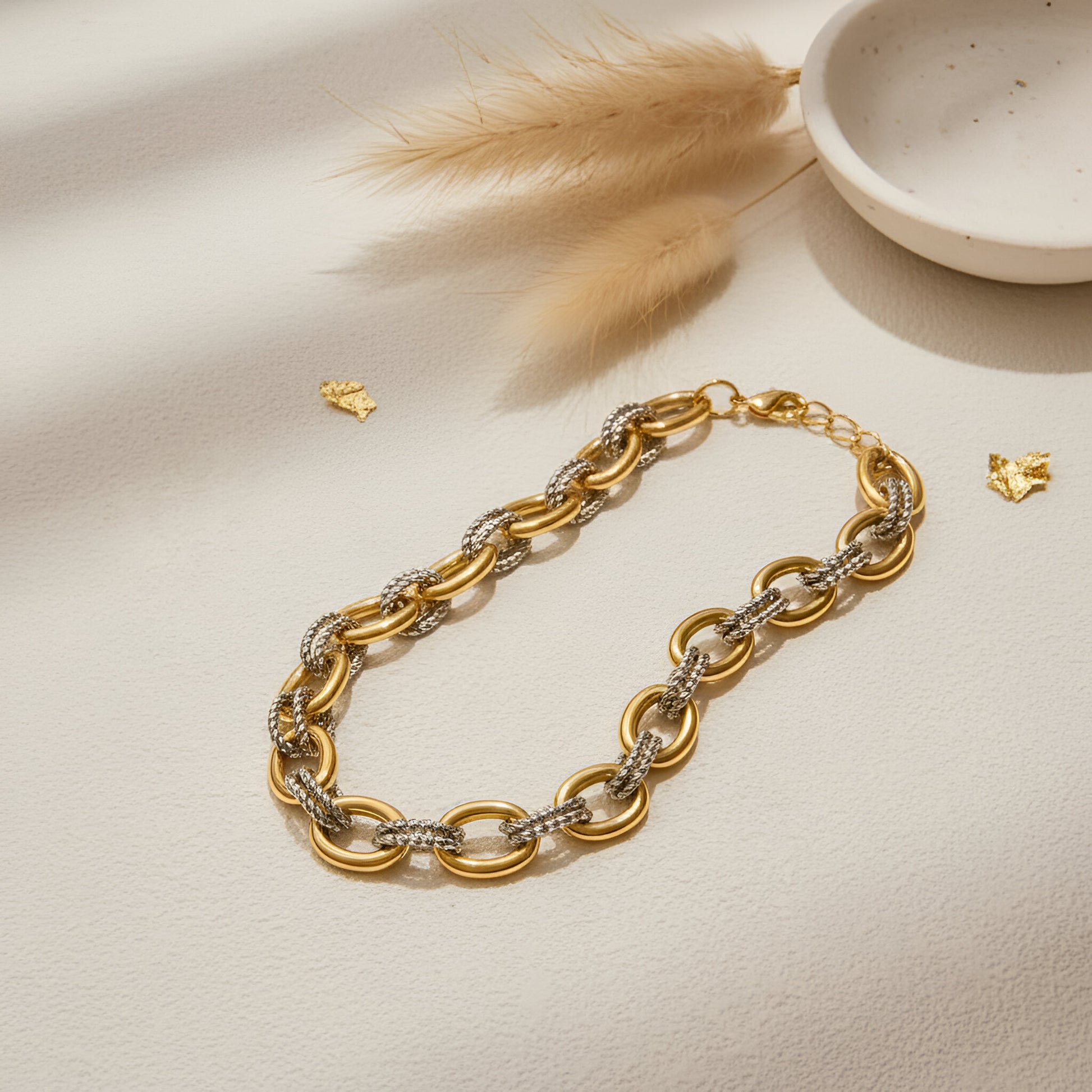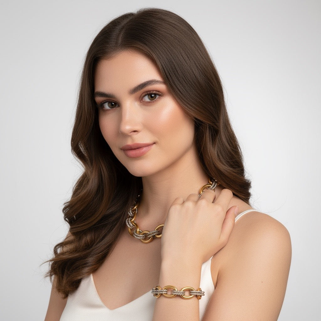Es una cadena de eslabones gruesos, dorados y con forma ovalada, unidos por dos eslabones plateados, ovalados en forma de torzal. Forman una cadena gruesa y preciosa, dando apariencia de qué con eso es suficiente por eso su nombre Enough!! Recordándote que tú sola, ya eres suficiente