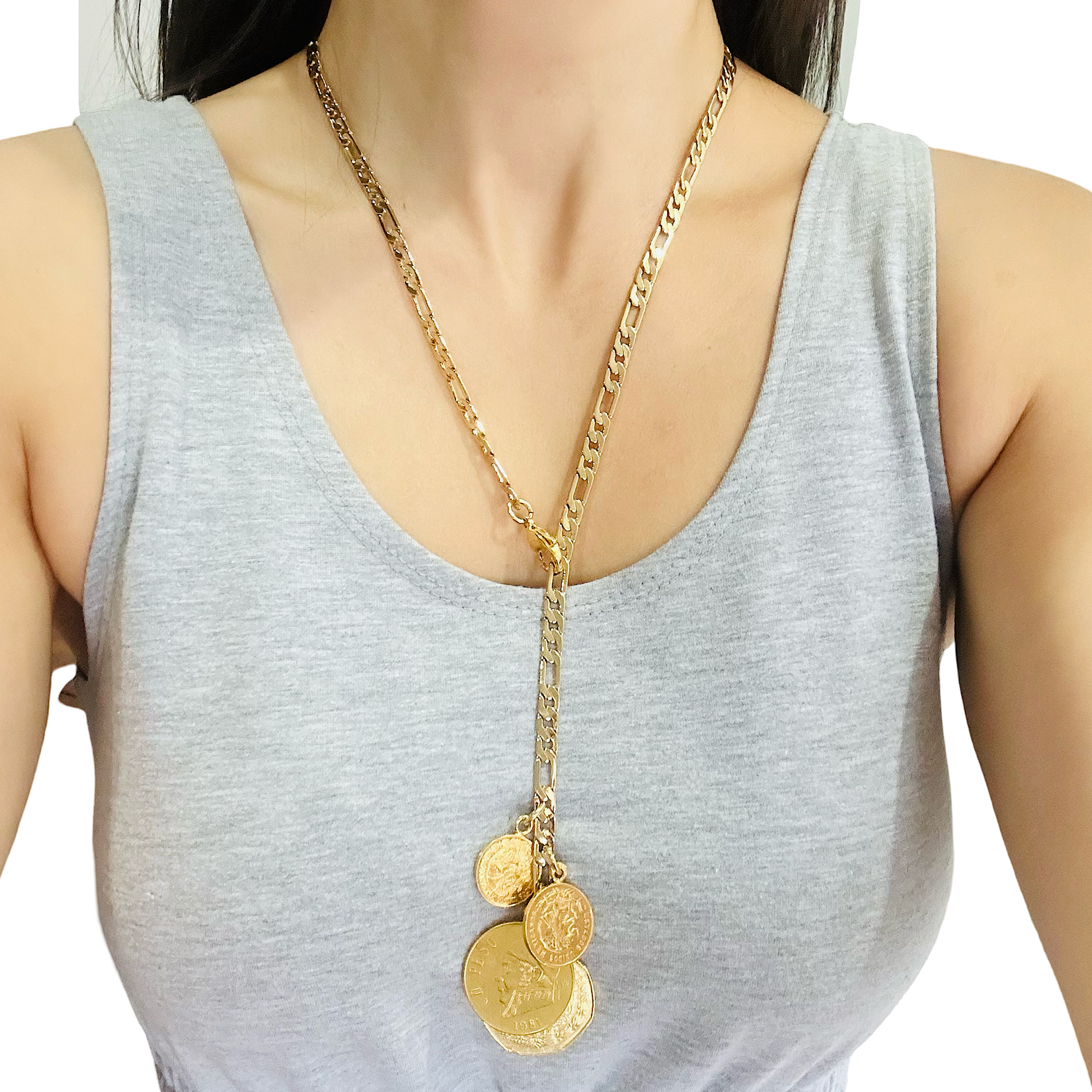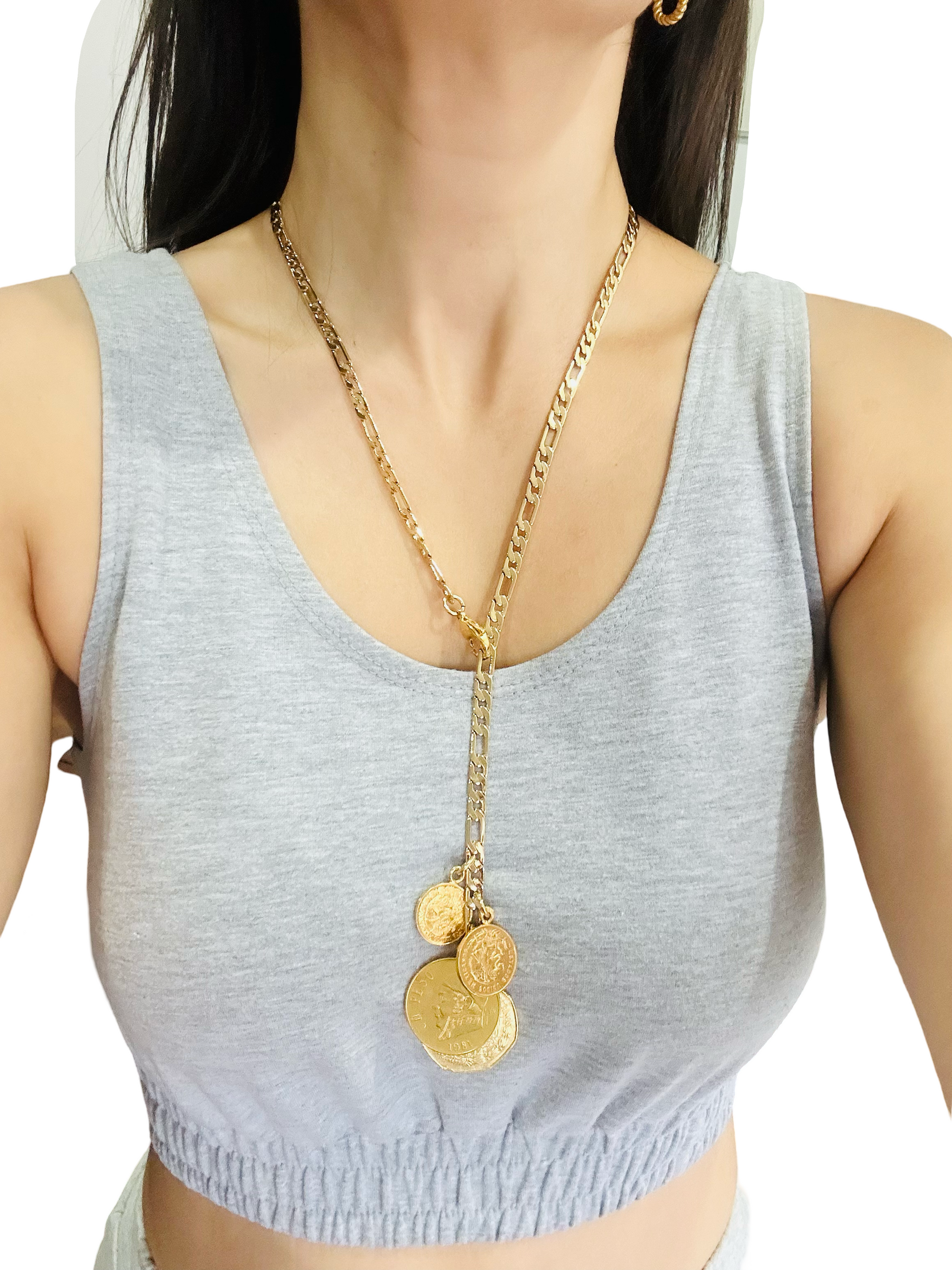 • En un extremo cuenta con broche y en el otro tiene varias monedas colgantes