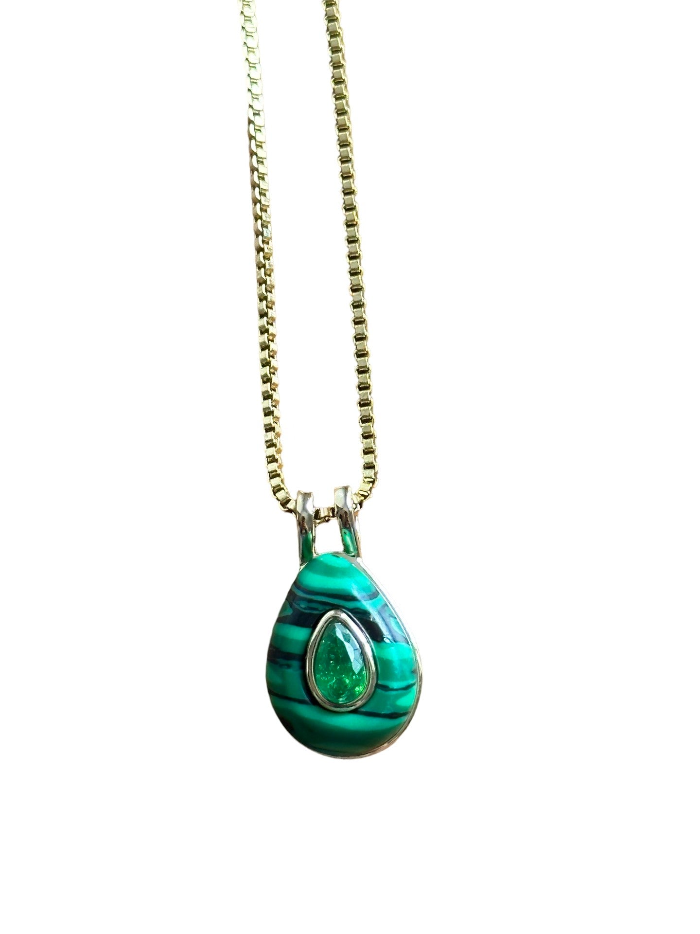 Es una piedra de cuarzo verde montada en una base de acero titanio con 6 baños de oro laminado de 18k y un cristal en el medio,