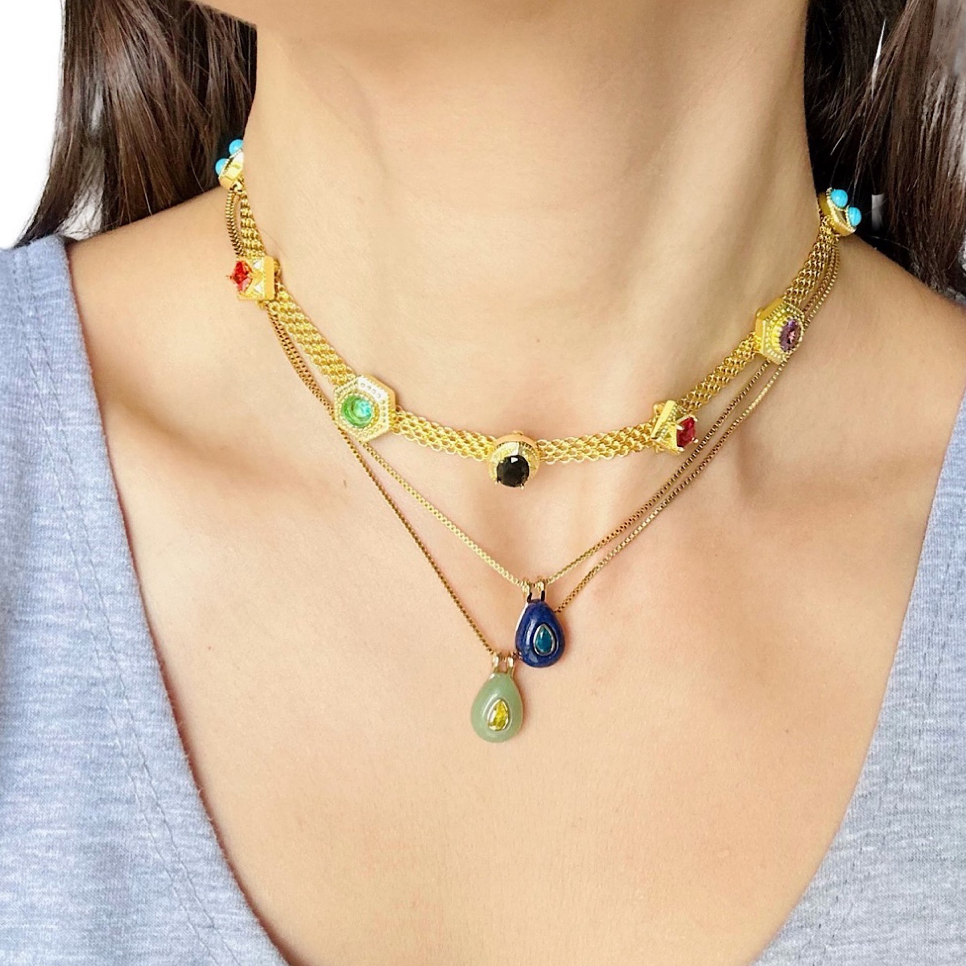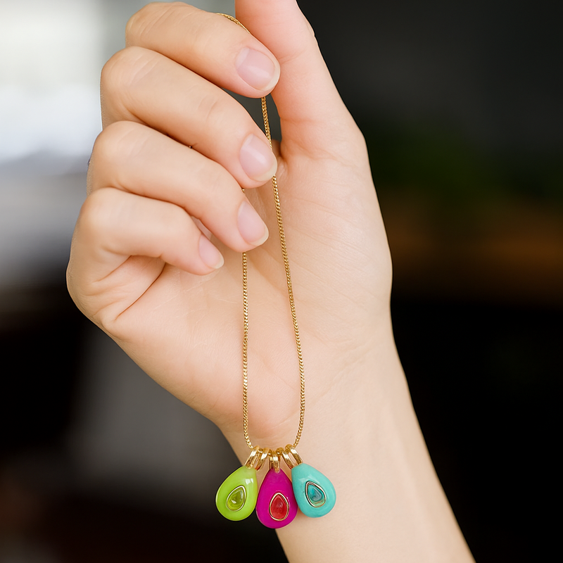 El verde es por agosto, cuando renuncié a un trabajo que ya no me hacía feliz. Tomé la decisión con miedo, pero también con dignidad.El celeste es marzo, el mes en que perdí a mi abuela. Fue mi raíz, mi refugio… llevar este charm es tenerla un poco más cerca.Y el azul representa octubre: el mes en que comencé de nuevo. Después de tanto dolor, sentí que algo dentro de mí volvía a respirar.