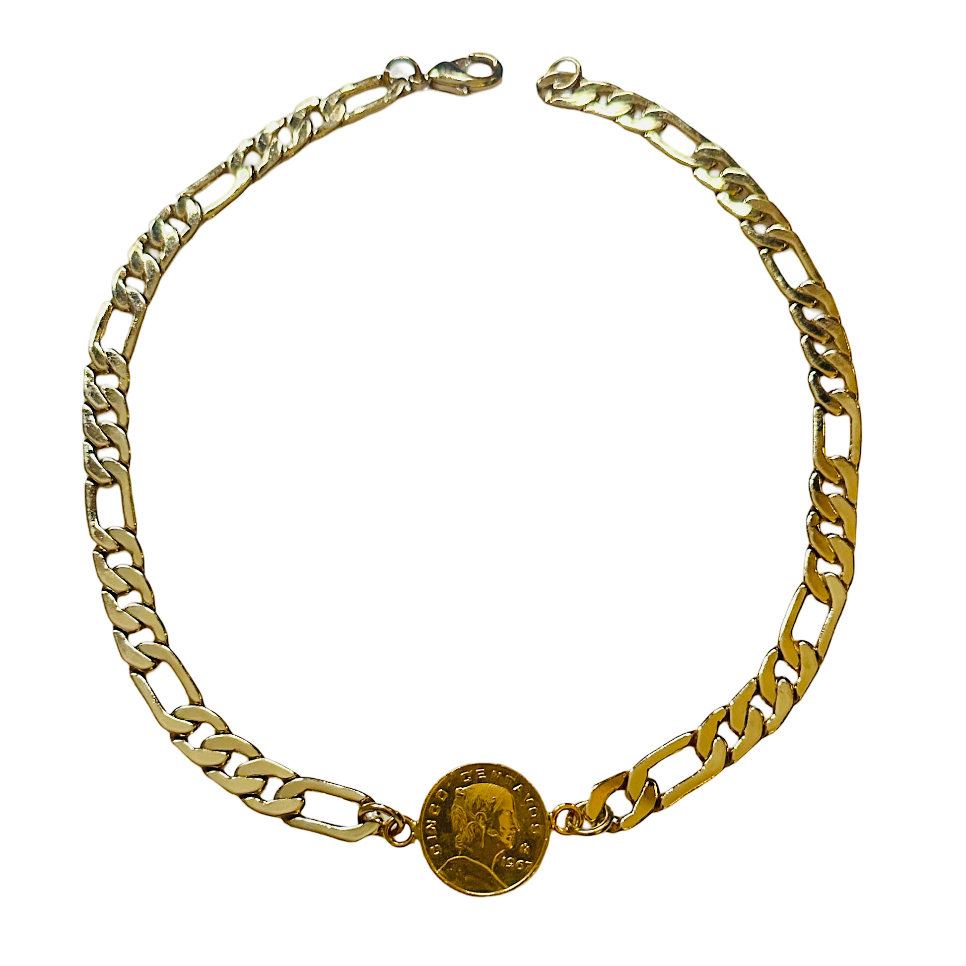 Elegante collar elaborado artesanalmente con monedas reales antiguas mexicanas, cuidadosamente bañadas con 6 capas de oro laminado de 18K. Cada eslabón con moneda mide aproximadamente 5.0 cm, dando un estilo único y sofisticado con una longitud total de 45.5 cm. Todos nuestros productos están hechos con materiales de la más alta calidad, garantizando belleza, durabilidad y exclusividad